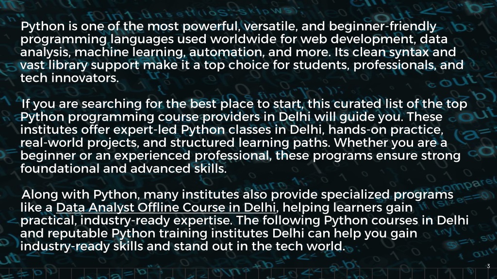 Python is one of the most powerful, versatile, and beginner-friendly programming languages used worldwide for web development, data analysis, machine learning, automation, and more. Its clean syntax and vast library support make it a top choice for students, professionals, and tech innovators. If you are searching for the best place to start, this curated list of the top Python programming course providers in Delhi will guide you. These institutes offer expert-led Python classes in Delhi, hands-on practice, real-world projects, and structured learning paths. Whether you are a beginner or an experienced professional, these programs ensure strong foundational and advanced skills. Along with Python, many institutes also provide specialized programs like a Data Analyst Offline Course in Delhi, helping learners gain practical, industry-ready expertise. The following Python courses in Delhi and reputable Python training institutes Delhi can help you gain industry-ready skills and stand out in the tech world.