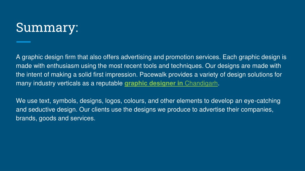 A graphic design firm that also offers advertising and promotion services. Each graphic design is made with enthusiasm using the most recent tools and techniques. Our designs are made with the intent of making a solid first impression. Pacewalk provides a variety of design solutions for many industry verticals as a reputable graphic designer in Chandigarh.<br>