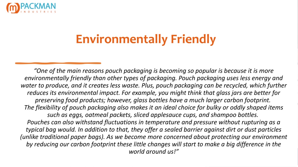Environmentally Friendly “One of the main reasons pouch packaging is becoming so popular is because it is more environmentally friendly than other types of packaging. Pouch packaging uses less energy and water to produce, and it creates less waste. Plus, pouch packaging can be recycled, which further reduces its environmental impact. For example, you might think that glass jars are better for preserving food products; however, glass bottles have a much larger carbon footprint. The flexibility of pouch packaging also makes it an ideal choice for bulky or oddly shaped items such as eggs, oatmeal packets, sliced applesauce cups, and shampoo bottles. Pouches can also withstand fluctuations in temperature and pressure without rupturing as a typical bag would. In addition to that, they offer a sealed barrier against dirt or dust particles (unlike traditional paper bags). As we become more concerned about protecting our environment by reducing our carbon footprint these little changes will start to make a big difference in the world around us!”