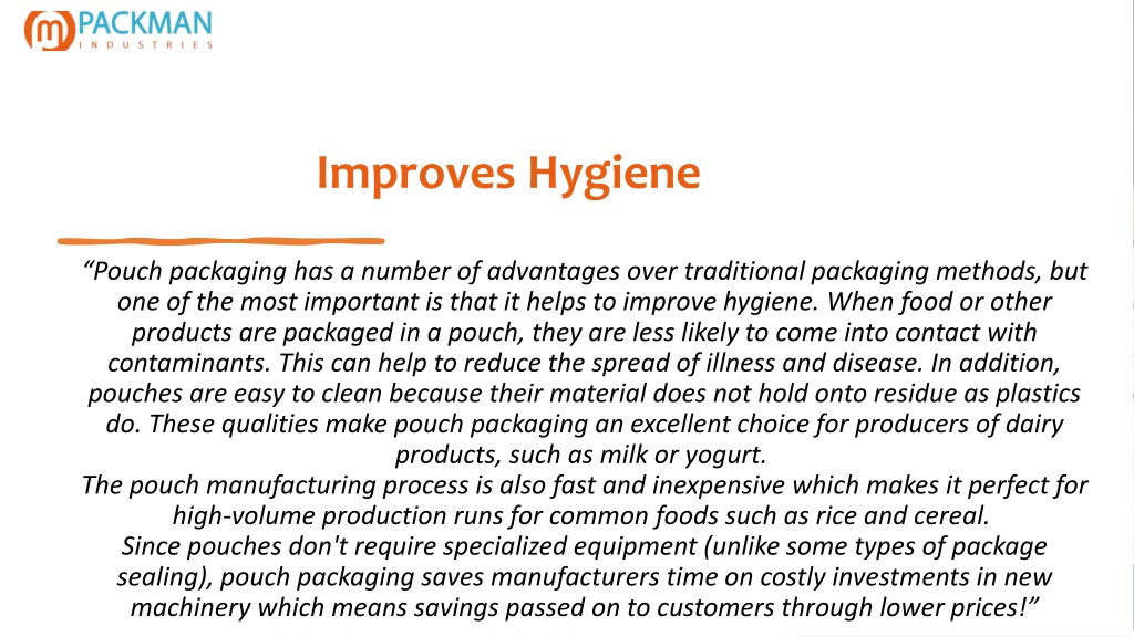 Improves Hygiene “Pouch packaging has a number of advantages over traditional packaging methods, but one of the most important is that it helps to improve hygiene. When food or other products are packaged in a pouch, they are less likely to come into contact with contaminants. This can help to reduce the spread of illness and disease. In addition, pouches are easy to clean because their material does not hold onto residue as plastics do. These qualities make pouch packaging an excellent choice for producers of dairy products, such as milk or yogurt. The pouch manufacturing process is also fast and inexpensive which makes it perfect for high-volume production runs for common foods such as rice and cereal. Since pouches don't require specialized equipment (unlike some types of package sealing), pouch packaging saves manufacturers time on costly investments in new machinery which means savings passed on to customers through lower prices!”