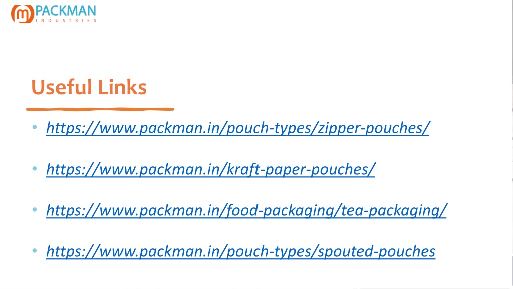 Useful Links • https://www.packman.in/pouch-types/zipper-pouches/ • https://www.packman.in/kraft-paper-pouches/ • https://www.packman.in/food-packaging/tea-packaging/ • https://www.packman.in/pouch-types/spouted-pouches