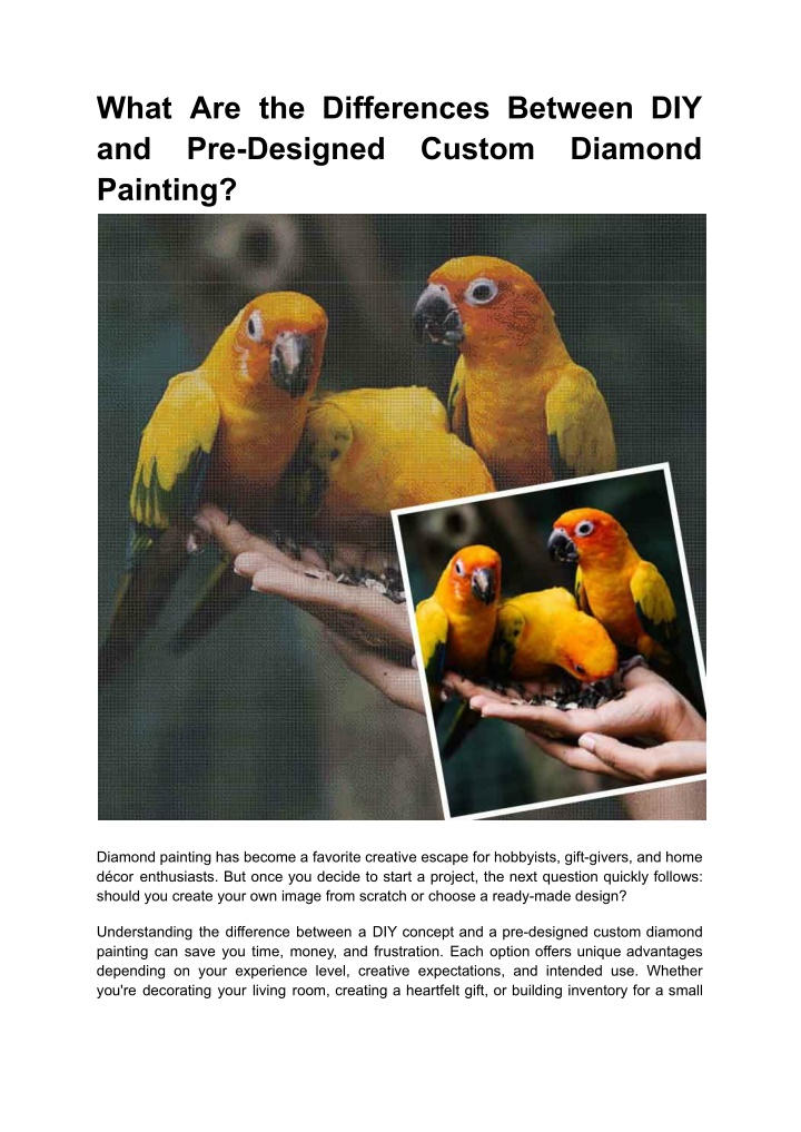 What Are the Differences Between DIY and Pre-Designed Custom Diamond Painting? Diamond painting has become a favorite creative escape for hobbyists, gift-givers, and home décor enthusiasts. But once you decide to start a project, the next question quickly follows: should you create your own image from scratch or choose a ready-made design? Understanding the difference between a DIY concept and a pre-designed custom diamond painting can save you time, money, and frustration. Each option offers unique advantages depending on your experience level, creative expectations, and intended use. Whether you're decorating your living room, creating a heartfelt gift, or building inventory for a small