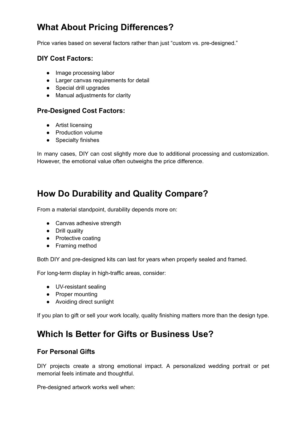 What About Pricing Differences? Price varies based on several factors rather than just “custom vs. pre-designed.” DIY Cost Factors: ● Image processing labor ● Larger canvas requirements for detail ● Special drill upgrades ● Manual adjustments for clarity Pre-Designed Cost Factors: ● Artist licensing ● Production volume ● Specialty finishes In many cases, DIY can cost slightly more due to additional processing and customization. However, the emotional value often outweighs the price difference. How Do Durability and Quality Compare? From a material standpoint, durability depends more on: ● Canvas adhesive strength ● Drill quality ● Protective coating ● Framing method Both DIY and pre-designed kits can last for years when properly sealed and framed. For long-term display in high-traffic areas, consider: ● UV-resistant sealing ● Proper mounting ● Avoiding direct sunlight If you plan to gift or sell your work locally, quality finishing matters more than the design type. Which Is Better for Gifts or Business Use? For Personal Gifts DIY projects create a strong emotional impact. A personalized wedding portrait or pet memorial feels intimate and thoughtful. Pre-designed artwork works well when: