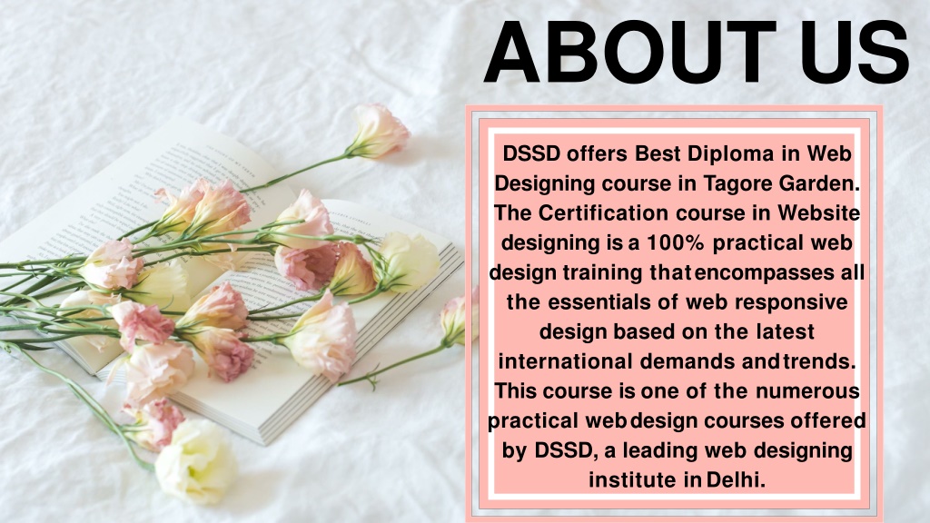 ABOUTUS DSSD offers Best Diploma in Web Designing course in Tagore Garden. The Certification course in Website designing is a 100% practical web design training thatencompasses all the essentials of web responsive design based on the latest international demands andtrends. This course is one of the numerous practical webdesign courses offered by DSSD, a leading web designing institute inDelhi.