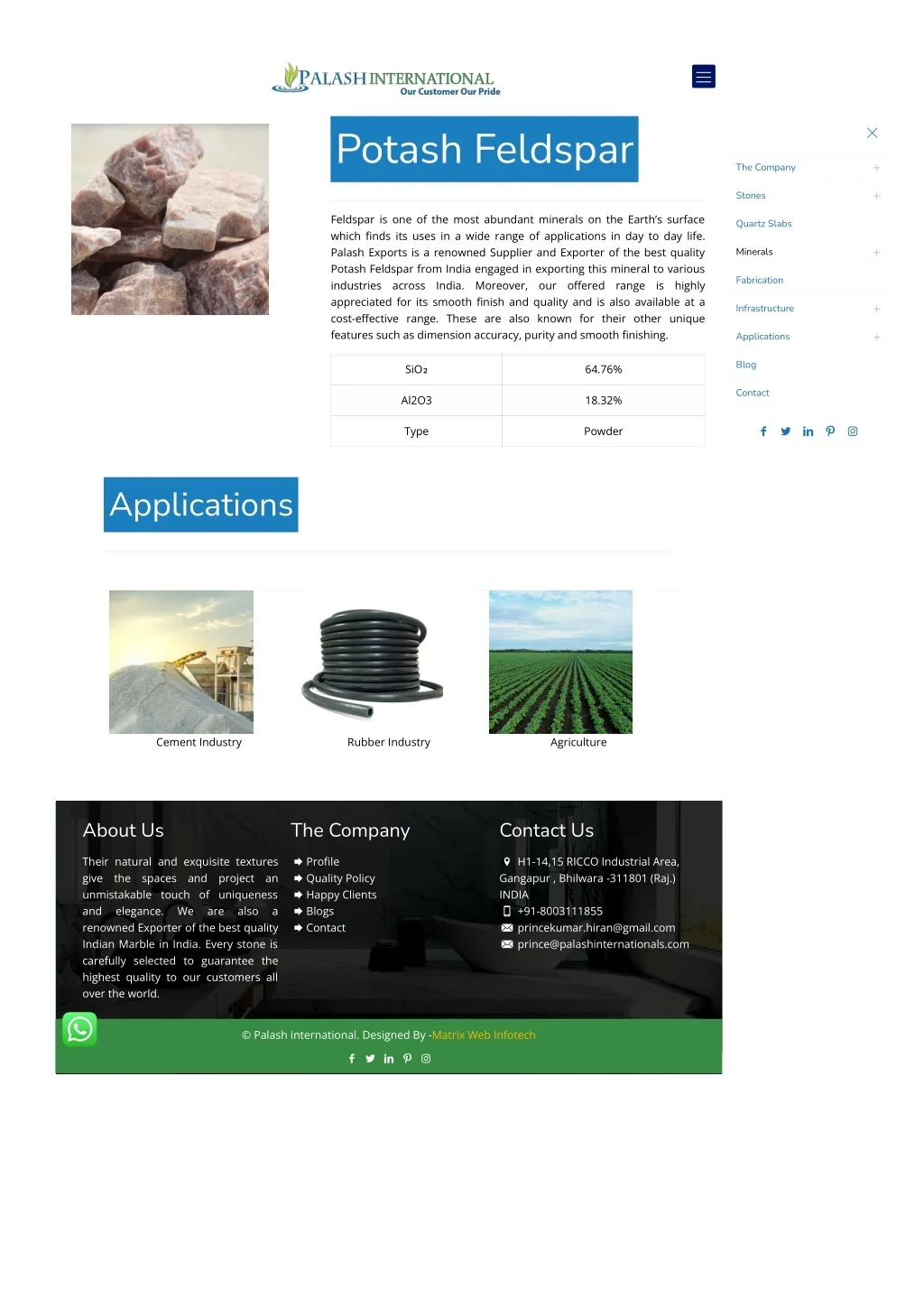 Quartz Powder Exporters in India Potash Feldspar + The Company + Stones Feldspar is one of the most abundant minerals on the Earth’s surface which 몭nds its uses in a wide range of applications in day to day life. Palash Exports is a renowned Supplier and Exporter of the best quality Potash Feldspar from India engaged in exporting this mineral to various industries across India. Moreover, our o몭ered range is highly appreciated for its smooth 몭nish and quality and is also available at a cost-e몭ective range. These are also known for their other unique features such as dimension accuracy, purity and smooth 몭nishing. Quartz Slabs + Minerals Fabrication + Infrastructure + Applications Blog SiO₂ 64.76% Contact Al2O3 18.32% Type Powder Applications Cement Industry Rubber Industry Agriculture About Us The Company Contact Us Their natural and exquisite textures give the spaces and project an unmistakable touch of uniqueness and elegance. We renowned Exporter of the best quality Indian Marble in India. Every stone is carefully selected to guarantee the highest quality to our customers all over the world. Pro몭le Quality Policy Happy Clients Blogs Contact H1-14,15 RICCO Industrial Area, Gangapur , Bhilwara -311801 (Raj.) INDIA +91-8003111855 princekumar.hiran@gmail.com prince@palashinternationals.com are also a © Palash International. Designed By -Matrix Web Infotech