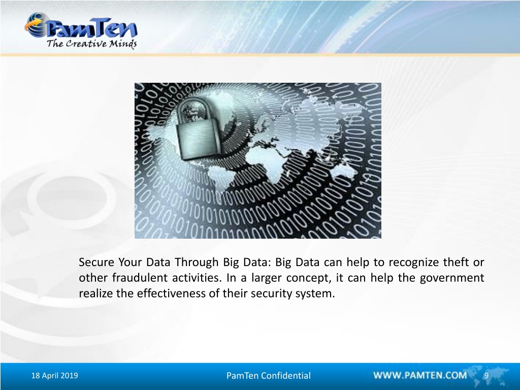Secure Your Data Through Big Data: Big Data can help to recognize theft or other fraudulent activities. In a larger concept, it can help the government realize the effectiveness of their security system. PamTen Confidential