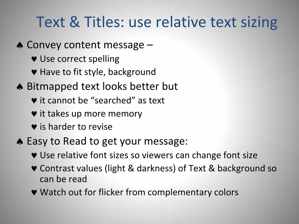 Text & Titles: use relative text sizing • Convey content message – • Use correct spelling • Have to fit style, background • Bitmapped text looks better but • it cannot be “searched” as text • it takes up more memory • is harder to revise • Easy to Read to get your message: • Use relative font sizes so viewers can change font size • Contrast values (light & darkness) of Text & background so can be read • Watch out for flicker from complementary colors