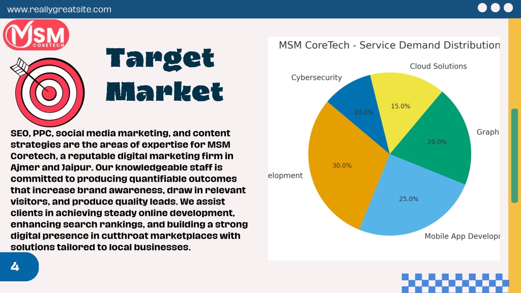 www.reallygreatsite.com Target Market SEO, PPC, social media marketing, and content strategies are the areas of expertise for MSM Coretech, a reputable digital marketing firm in Ajmer and Jaipur. Our knowledgeable staff is committed to producing quantifiable outcomes that increase brand awareness, draw in relevant visitors, and produce quality leads. We assist clients in achieving steady online development, enhancing search rankings, and building a strong digital presence in cutthroat marketplaces with solutions tailored to local businesses. 4