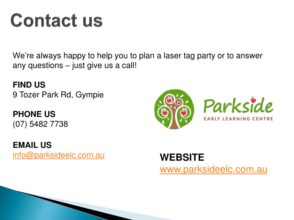 Contact us We’re always happy to help you to plan a laser tag party or to answer any questions – just give us a call!FIND US9 Tozer Park Rd, GympiePHONE US(07) 5482 7738 EMAIL USinfo@parksideelc.com.au WEBSITEwww.parksideelc.com.au