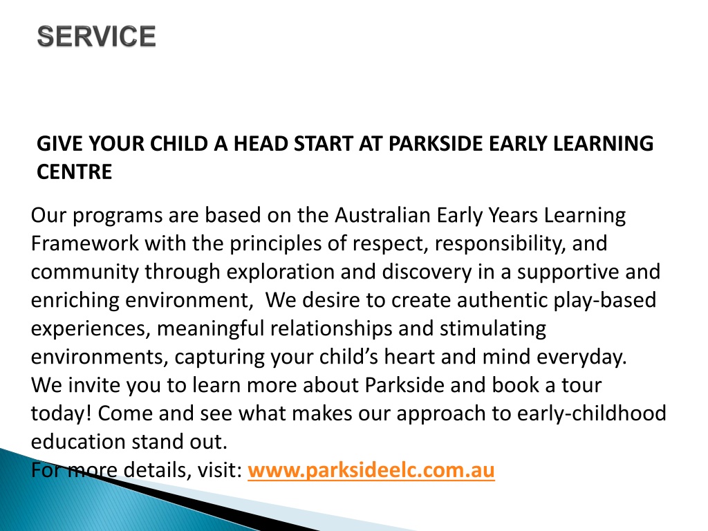 SERVICE GIVE YOUR CHILD A HEAD START AT PARKSIDE EARLY LEARNING CENTRE Our programs are based on the Australian Early Years Learning Framework with the principles of respect, responsibility, and community through exploration and discovery in a supportive and enriching environment, We desire to create authentic play-based experiences, meaningful relationships and stimulating environments, capturing your child’s heart and mind everyday. We invite you to learn more about Parkside and book a tour today! Come and see what makes our approach to early-childhood education stand out. For more details, visit: www.parksideelc.com.au