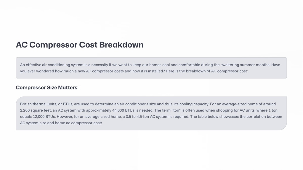 AC Compressor Cost Breakdown An effective air conditioning system is a necessity if we want to keep our homes cool and comfortable during the sweltering summer months. Have you ever wondered how much a new AC compressor costs and how it is installed? Here is the breakdown of AC compressor cost: Compressor Size Matters: British thermal units, or BTUs, are used to determine an air conditioner's size and thus, its cooling capacity. For an average-sized home of around 2,200 square feet, an AC system with approximately 44,000 BTUs is needed. The term "ton" is often used when shopping for AC units, where 1 ton equals 12,000 BTUs. However, for an average-sized home, a 3.5 to 4.5-ton AC system is required. The table below showcases the correlation between AC system size and home ac compressor cost:
