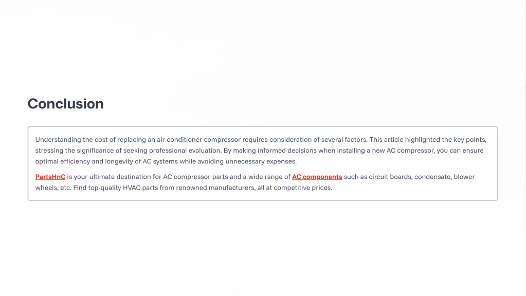 Conclusion Understanding the cost of replacing an air conditioner compressor requires consideration of several factors. This article highlighted the key points, stressing the significance of seeking professional evaluation. By making informed decisions when installing a new AC compressor, you can ensure optimal efficiency and longevity of AC systems while avoiding unnecessary expenses. PartsHnC is your ultimate destination for AC compressor parts and a wide range of AC components such as circuit boards, condensate, blower wheels, etc. Find top-quality HVAC parts from renowned manufacturers, all at competitive prices.
