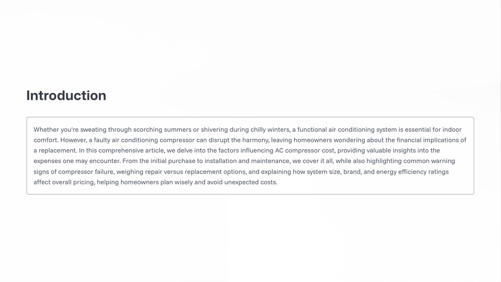 Introduction Whether you're sweating through scorching summers or shivering during chilly winters, a functional air conditioning system is essential for indoor comfort. However, a faulty air conditioning compressor can disrupt the harmony, leaving homeowners wondering about the financial implications of a replacement. In this comprehensive article, we delve into the factors influencing AC compressor cost, providing valuable insights into the expenses one may encounter. From the initial purchase to installation and maintenance, we cover it all, while also highlighting common warning signs of compressor failure, weighing repair versus replacement options, and explaining how system size, brand, and energy efficiency ratings affect overall pricing, helping homeowners plan wisely and avoid unexpected costs.