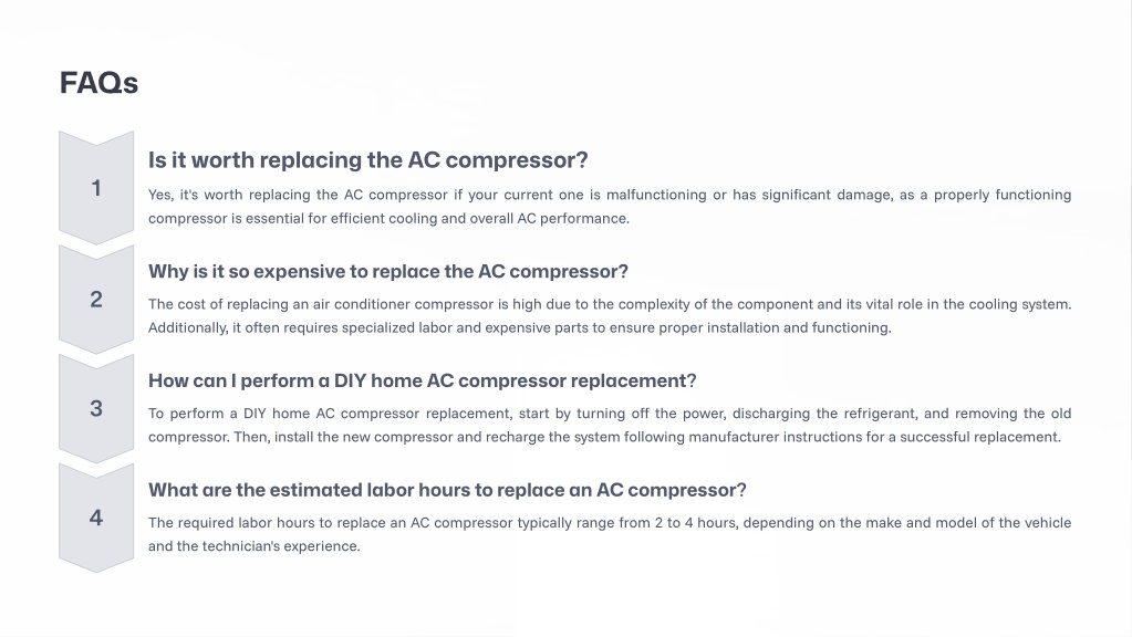 FAQs Is it worth replacing the AC compressor? 1 Yes, it's worth replacing the AC compressor if your current one is malfunctioning or has significant damage, as a properly functioning compressor is essential for efficient cooling and overall AC performance. Why is it so expensive to replace the AC compressor? 2 The cost of replacing an air conditioner compressor is high due to the complexity of the component and its vital role in the cooling system. Additionally, it often requires specialized labor and expensive parts to ensure proper installation and functioning. How can I perform aDIY home AC compressor replacement? 3 To perform a DIY home AC compressor replacement, start by turning off the power, discharging the refrigerant, and removing the old compressor. Then, install the new compressor and recharge the system following manufacturer instructions for a successful replacement. What are the estimatedlabor hours to replace an AC compressor? 4 The required labor hours to replace an AC compressor typically range from 2 to 4 hours, depending on the make and model of the vehicle and the technician's experience.