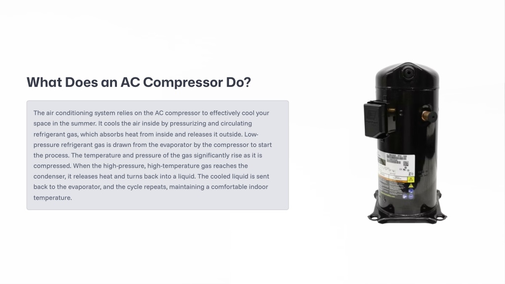 What Does an AC Compressor Do? The air conditioning system relies on the AC compressor to effectively cool your space in the summer. It cools the air inside by pressurizing and circulating refrigerant gas, which absorbs heat from inside and releases it outside. Low- pressure refrigerant gas is drawn from the evaporator by the compressor to start the process. The temperature and pressure of the gas significantly rise as it is compressed. When the high-pressure, high-temperature gas reaches the condenser, it releases heat and turns back into a liquid. The cooled liquid is sent back to the evaporator, and the cycle repeats, maintaining a comfortable indoor temperature.