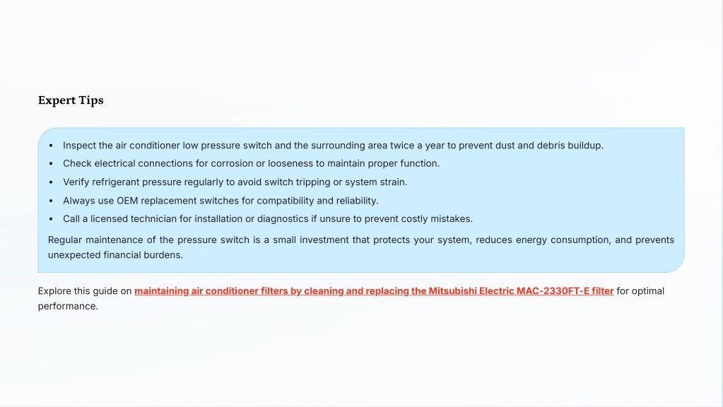 Expert Tips Inspect the air conditioner low pressure switch and the surrounding area twice a year to prevent dust and debris buildup. Check electrical connections for corrosion or looseness to maintain proper function. Verify refrigerant pressure regularly to avoid switch tripping or system strain. Always use OEM replacement switches for compatibility and reliability. Call a licensed technician for installation or diagnostics if unsure to prevent costly mistakes. Regular maintenance of the pressure switch is a small investment that protects your system, reduces energy consumption, and prevents unexpected financial burdens. Explore this guide on maintaining air conditioner filters by cleaning and replacing the Mitsubishi Electric MAC-2330FT-E filter for optimal performance.