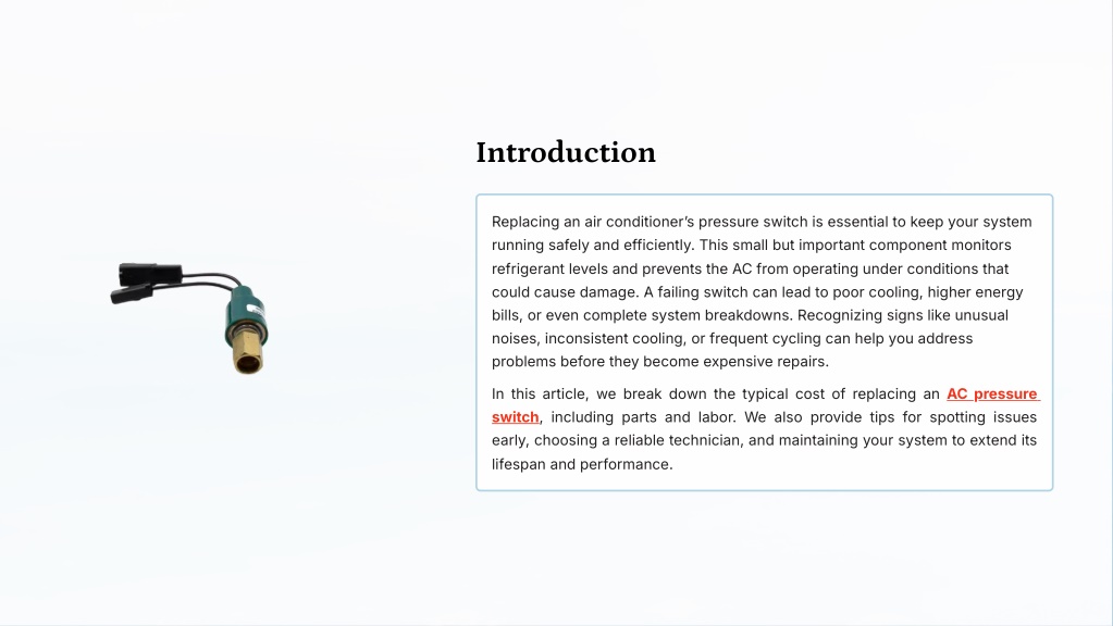 Introduction Replacing an air conditioner¾s pressure switch is essential to keep your system running safely and efficiently. This small but important component monitors refrigerant levels and prevents the AC from operating under conditions that could cause damage. A failing switch can lead to poor cooling, higher energy bills, or even complete system breakdowns. Recognizing signs like unusual noises, inconsistent cooling, or frequent cycling can help you address problems before they become expensive repairs. In this article, we break down the typical cost of replacing an AC pressure switch, including parts and labor. We also provide tips for spotting issues early, choosing a reliable technician, and maintaining your system to extend its lifespan and performance.