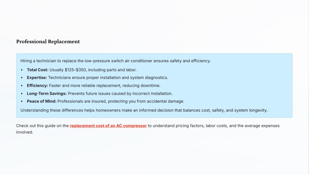 Professional Replacement Hiring a technician to replace the low-pressure switch air conditioner ensures safety and efficiency. Total Cost: Usually $1253$350, including parts and labor. Expertise: Technicians ensure proper installation and system diagnostics. Efficiency: Faster and more reliable replacement, reducing downtime. Long-Term Savings: Prevents future issues caused by incorrect installation. Peace of Mind: Professionals are insured, protecting you from accidental damage. Understanding these differences helps homeowners make an informed decision that balances cost, safety, and system longevity. Check out this guide on the replacement cost of an AC compressor to understand pricing factors, labor costs, and the average expenses involved.