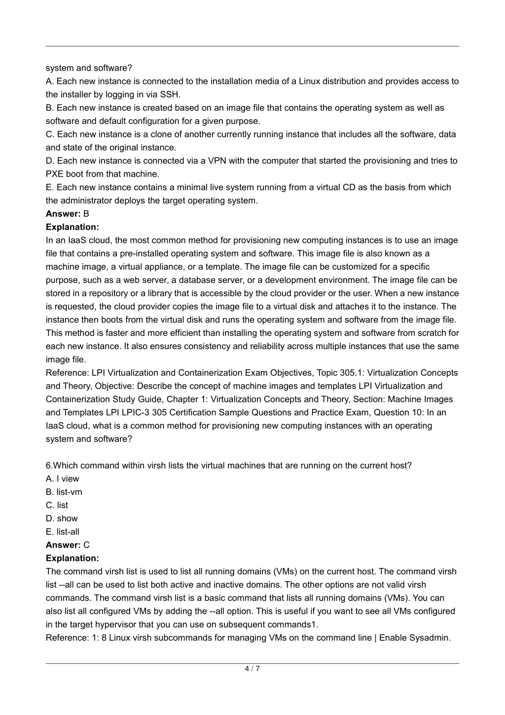 system and software? A. Each new instance is connected to the installation media of a Linux distribution and provides access to the installer by logging in via SSH. B. Each new instance is created based on an image file that contains the operating system as well as software and default configuration for a given purpose. C. Each new instance is a clone of another currently running instance that includes all the software, data and state of the original instance. D. Each new instance is connected via a VPN with the computer that started the provisioning and tries to PXE boot from that machine. E. Each new instance contains a minimal live system running from a virtual CD as the basis from which the administrator deploys the target operating system. Answer: B Explanation: In an IaaS cloud, the most common method for provisioning new computing instances is to use an image file that contains a pre-installed operating system and software. This image file is also known as a machine image, a virtual appliance, or a template. The image file can be customized for a specific purpose, such as a web server, a database server, or a development environment. The image file can be stored in a repository or a library that is accessible by the cloud provider or the user. When a new instance is requested, the cloud provider copies the image file to a virtual disk and attaches it to the instance. The instance then boots from the virtual disk and runs the operating system and software from the image file. This method is faster and more efficient than installing the operating system and software from scratch for each new instance. It also ensures consistency and reliability across multiple instances that use the same image file. Reference: LPI Virtualization and Containerization Exam Objectives, Topic 305.1: Virtualization Concepts and Theory, Objective: Describe the concept of machine images and templates LPI Virtualization and Containerization Study Guide, Chapter 1: Virtualization Concepts and Theory, Section: Machine Images and Templates LPI LPIC-3 305 Certification Sample Questions and Practice Exam, Question 10: In an IaaS cloud, what is a common method for provisioning new computing instances with an operating system and software? 6.Which command within virsh lists the virtual machines that are running on the current host? A. I view B. list-vm C. list D. show E. list-all Answer: C Explanation: The command virsh list is used to list all running domains (VMs) on the current host. The command virsh list --all can be used to list both active and inactive domains. The other options are not valid virsh commands. The command virsh list is a basic command that lists all running domains (VMs). You can also list all configured VMs by adding the --all option. This is useful if you want to see all VMs configured in the target hypervisor that you can use on subsequent commands1. Reference: 1: 8 Linux virsh subcommands for managing VMs on the command line | Enable Sysadmin. 4 / 7