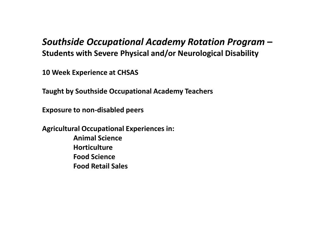 Southside Occupational Academy Rotation Program – Students with Severe Physical and/or Neurological Disability 10 Week Experience at CHSAS Taught by Southside Occupational Academy Teachers Exposure to non-disabled peers Agricultural Occupational Experiences in: Animal Science Horticulture Food Science Food Retail Sales