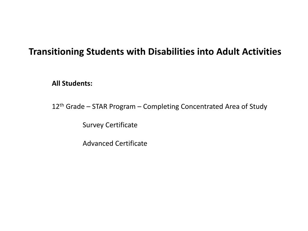 Transitioning Students with Disabilities into Adult Activities All Students: 12th Grade – STAR Program – Completing Concentrated Area of Study Survey Certificate Advanced Certificate
