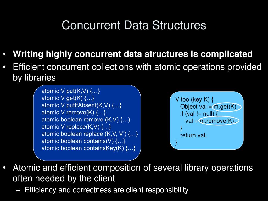 Concurrent Data Structures Writing highly concurrent data structures is complicated Efficient concurrent collections with atomic operations provided by libraries Atomic and efficient composition of several library operations often needed by the client Efficiency and correctness are client responsibility atomic V put(K,V) {…} atomic V get(K) {…} atomic V putIfAbsent(K,V) {…} atomic V remove(K) {…} atomic boolean remove (K,V) {…} atomic V replace(K,V) {…} atomic boolean replace (K,V, V’) {…} atomic boolean contains(V) {…} atomic boolean containsKey(K) {…} V foo (key K) { Object val = m.get(K) ; if (val != null) { val = m.remove(K); } return val; }
