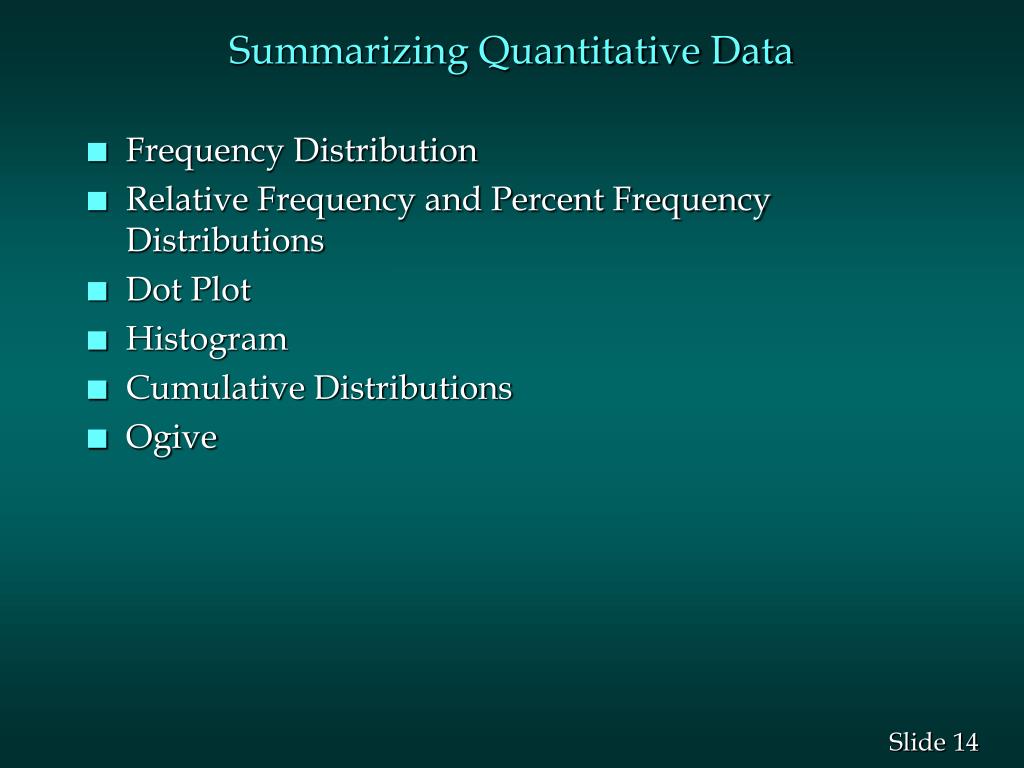 Summarizing Quantitative Data • Frequency Distribution • Relative Frequency and Percent Frequency Distributions • Dot Plot • Histogram • Cumulative Distributions • Ogive