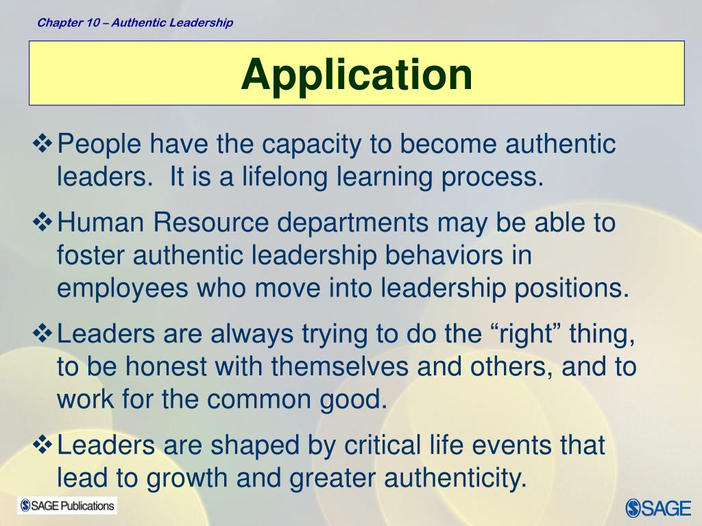 People have the capacity to become authentic leaders. It is a lifelong learning process. Human Resource departments may be able to foster authentic leadership behaviors in employees who move into leadership positions. Leaders are always trying to do the “right” thing, to be honest with themselves and others, and to work for the common good. Leaders are shaped by critical life events that lead to growth and greater authenticity. Application