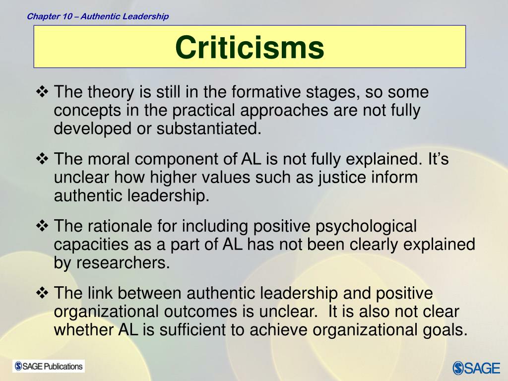 Criticisms • The theory is still in the formative stages, so some concepts in the practical approaches are not fully developed or substantiated. • The moral component of AL is not fully explained. It’s unclear how higher values such as justice inform authentic leadership. • The rationale for including positive psychological capacities as a part of AL has not been clearly explained by researchers. • The link between authentic leadership and positive organizational outcomes is unclear. It is also not clear whether AL is sufficient to achieve organizational goals.