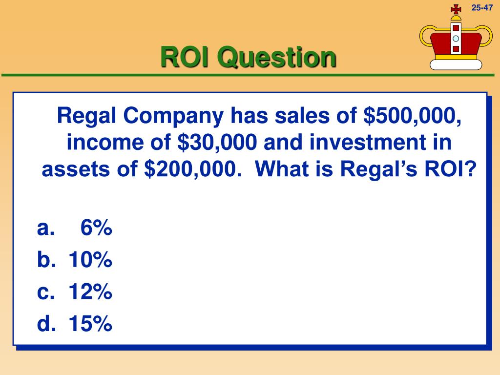 ROI Question Regal Company has sales of $500,000, income of $30,000 and investment in assets of $200,000. What is Regal’s ROI? a. 6% b. 10% c. 12% d. 15%