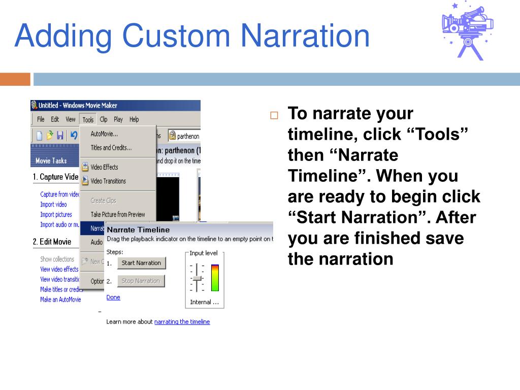 Adding Custom Narration • To narrate your timeline, click “Tools” then “Narrate Timeline”. When you are ready to begin click “Start Narration”. After you are finished save the narration