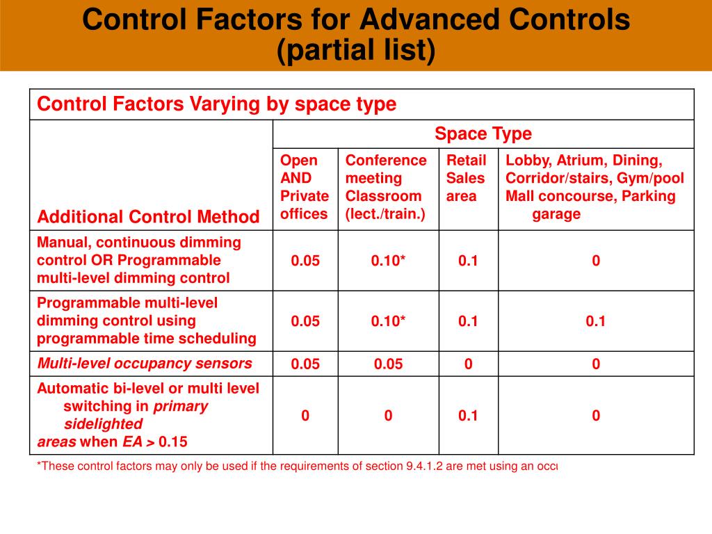 Advanced Control Incentives When all mandatory control requirements are met for a space AND advanced controls are installed in that space, THEN additional limited lighting power is allowed: • The allowance is based on conservative estimates of tradeoff (low percentage of expected savings) • Additional power can be used anywhere in the building • Additional Interior Lighting Power Allowance is calculated as: Lighting Power Under Control x Control Factor [Addendum “ac” to 90.1-2007 - completed]