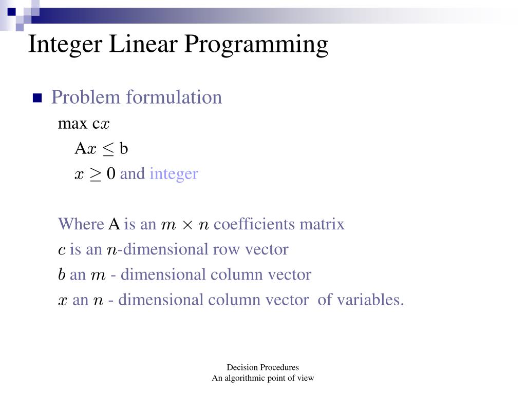 Integer Linear Programming • Problem formulation max cx Ax· b x¸ 0 and integer Where A is an m£n coefficients matrix c is an n-dimensional row vector b an m - dimensional column vector x an n - dimensional column vector of variables. Decision Procedures An algorithmic point of view