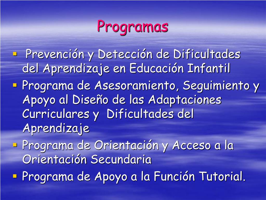 Programas • Prevención y Detección de Dificultades del Aprendizaje en Educación Infantil • Programa de Asesoramiento, Seguimiento y Apoyo al Diseño de las Adaptaciones Curriculares y Dificultades del Aprendizaje • Programa de Orientación y Acceso a la OrientaciónSecundaria • Programa de Apoyo a la Función Tutorial.