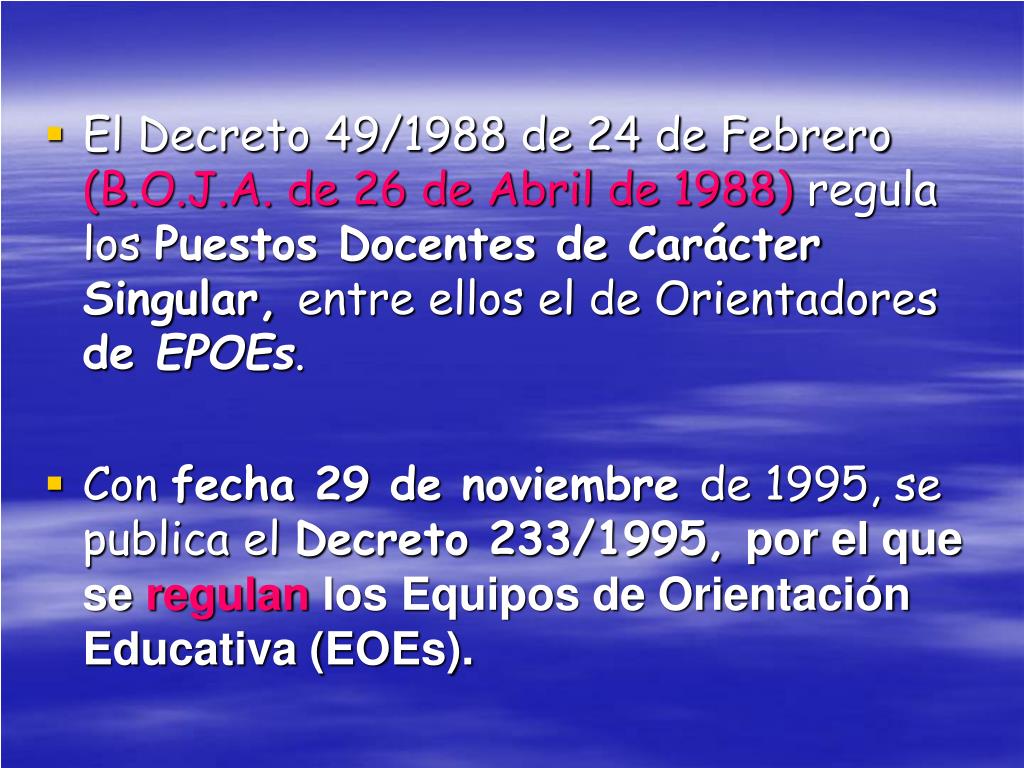 El Decreto 49/1988 de 24 de Febrero (B.O.J.A. de 26 de Abril de 1988) regula los Puestos Docentes de Carácter Singular, entre ellos el de Orientadores de EPOEs. • Con fecha 29 de noviembre de 1995, se publica el Decreto 233/1995, por el que se regulan los Equipos de Orientación Educativa (EOEs).