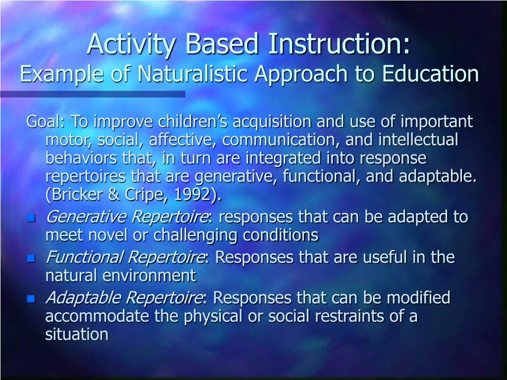 Activity Based Instruction: Example of Naturalistic Approach to Education Goal: To improve children’s acquisition and use of important motor, social, affective, communication, and intellectual behaviors that, in turn are integrated into response repertoires that are generative, functional, and adaptable. (Bricker & Cripe, 1992). • Generative Repertoire: responses that can be adapted to meet novel or challenging conditions • Functional Repertoire: Responses that are useful in the natural environment • Adaptable Repertoire: Responses that can be modified accommodate the physical or social restraints of a situation