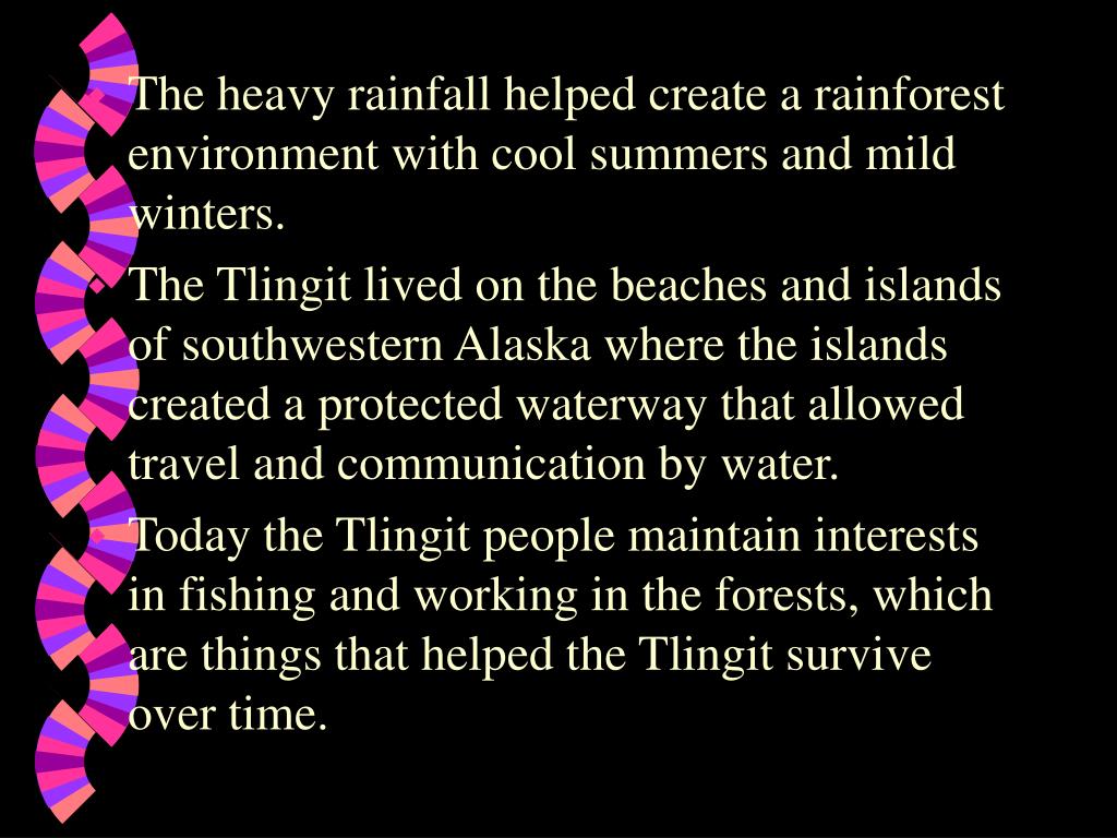 The heavy rainfall helped create a rainforest environment with cool summers and mild winters. • The Tlingit lived on the beaches and islands of southwestern Alaska where the islands created a protected waterway that allowed travel and communication by water. • Today the Tlingit people maintain interests in fishing and working in the forests, which are things that helped the Tlingit survive over time.