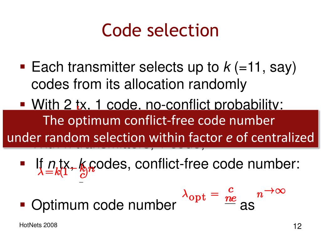 n 1 ! k k ( ( ) ) ¸ k n n 1 1 ¡ ¡ p = = c c k 1 ¡ p = ¸ c c = t o p n e Code selection • Each transmitter selects up to k (=11, say) codes from its allocation randomly • With 2 tx, 1 code, no-conflict probability: • With n transmitters, 1 code, • If n tx, k codes, conflict-free code number: • Optimum code number as The optimum conflict-free code number under random selection within factor e of centralized