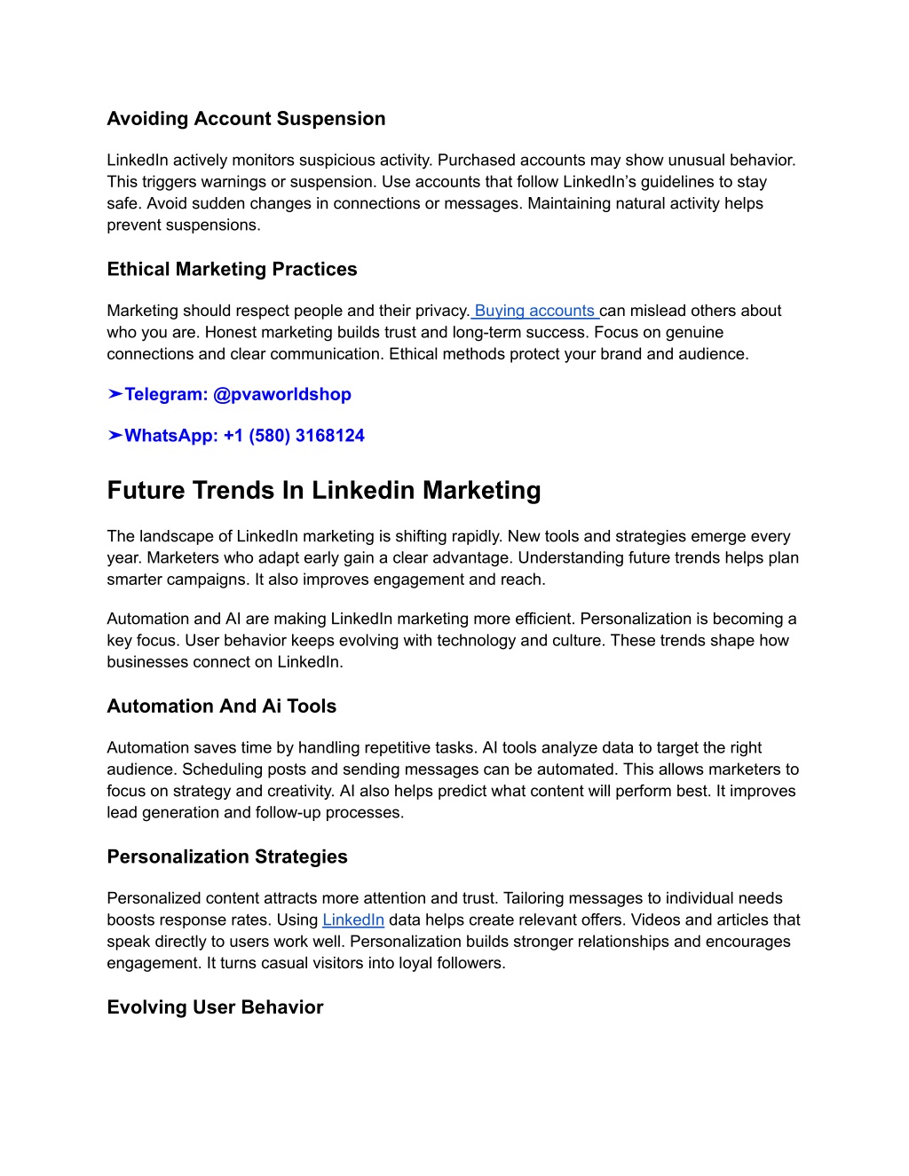 Avoiding Account Suspension LinkedIn actively monitors suspicious activity. Purchased accounts may show unusual behavior. This triggers warnings or suspension. Use accounts that follow LinkedIn’s guidelines to stay safe. Avoid sudden changes in connections or messages. Maintaining natural activity helps prevent suspensions. Ethical Marketing Practices Marketing should respect people and their privacy. Buying accounts can mislead others about who you are. Honest marketing builds trust and long-term success. Focus on genuine connections and clear communication. Ethical methods protect your brand and audience. ➤Telegram: @pvaworldshop ➤WhatsApp: +1 (580) 3168124 Future Trends In Linkedin Marketing The landscape of LinkedIn marketing is shifting rapidly. New tools and strategies emerge every year. Marketers who adapt early gain a clear advantage. Understanding future trends helps plan smarter campaigns. It also improves engagement and reach. Automation and AI are making LinkedIn marketing more efficient. Personalization is becoming a key focus. User behavior keeps evolving with technology and culture. These trends shape how businesses connect on LinkedIn. Automation And Ai Tools Automation saves time by handling repetitive tasks. AI tools analyze data to target the right audience. Scheduling posts and sending messages can be automated. This allows marketers to focus on strategy and creativity. AI also helps predict what content will perform best. It improves lead generation and follow-up processes. Personalization Strategies Personalized content attracts more attention and trust. Tailoring messages to individual needs boosts response rates. Using LinkedIn data helps create relevant offers. Videos and articles that speak directly to users work well. Personalization builds stronger relationships and encourages engagement. It turns casual visitors into loyal followers. Evolving User Behavior