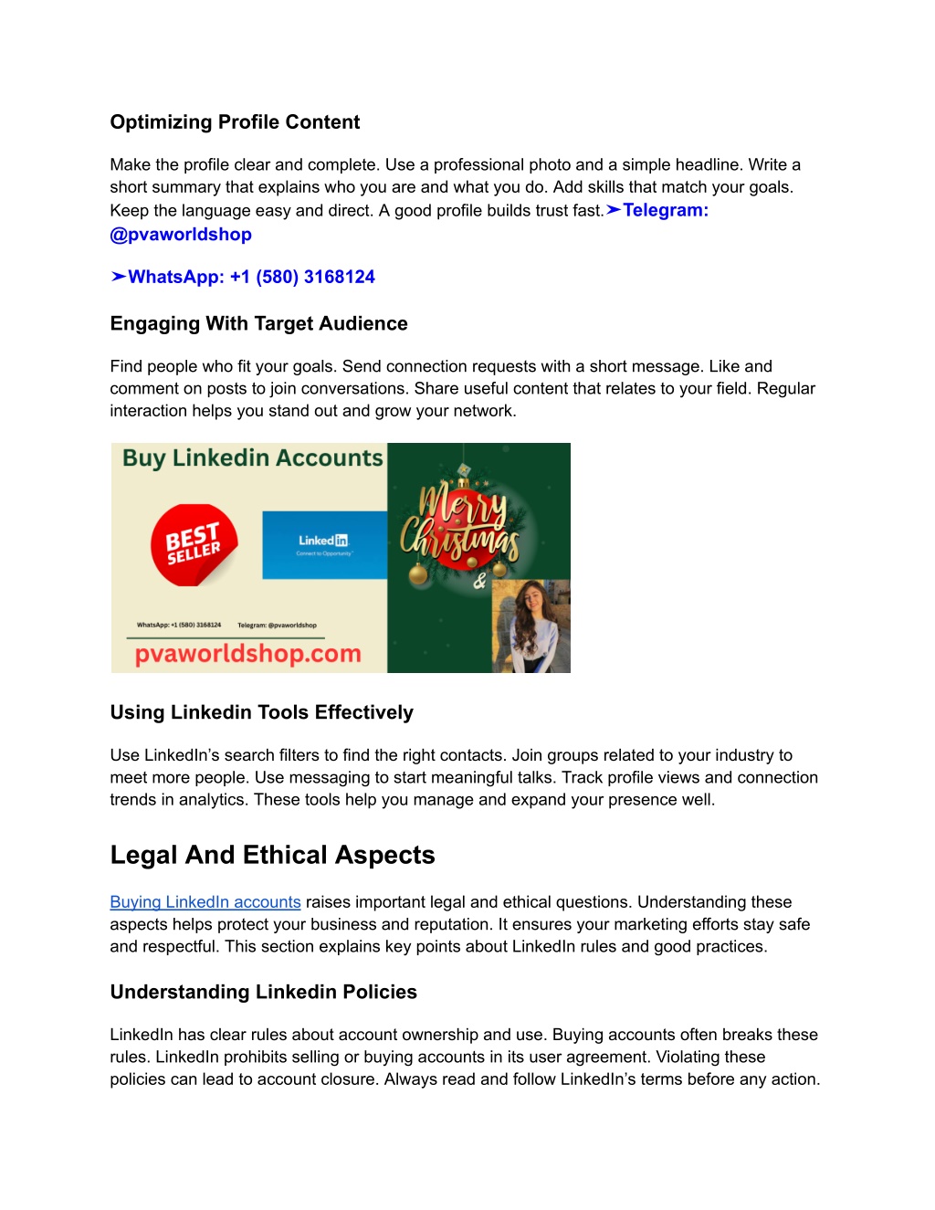 Optimizing Profile Content Make the profile clear and complete. Use a professional photo and a simple headline. Write a short summary that explains who you are and what you do. Add skills that match your goals. Keep the language easy and direct. A good profile builds trust fast.➤Telegram: @pvaworldshop ➤WhatsApp: +1 (580) 3168124 Engaging With Target Audience Find people who fit your goals. Send connection requests with a short message. Like and comment on posts to join conversations. Share useful content that relates to your field. Regular interaction helps you stand out and grow your network. Using Linkedin Tools Effectively Use LinkedIn’s search filters to find the right contacts. Join groups related to your industry to meet more people. Use messaging to start meaningful talks. Track profile views and connection trends in analytics. These tools help you manage and expand your presence well. Legal And Ethical Aspects Buying LinkedIn accounts raises important legal and ethical questions. Understanding these aspects helps protect your business and reputation. It ensures your marketing efforts stay safe and respectful. This section explains key points about LinkedIn rules and good practices. Understanding Linkedin Policies LinkedIn has clear rules about account ownership and use. Buying accounts often breaks these rules. LinkedIn prohibits selling or buying accounts in its user agreement. Violating these policies can lead to account closure. Always read and follow LinkedIn’s terms before any action.