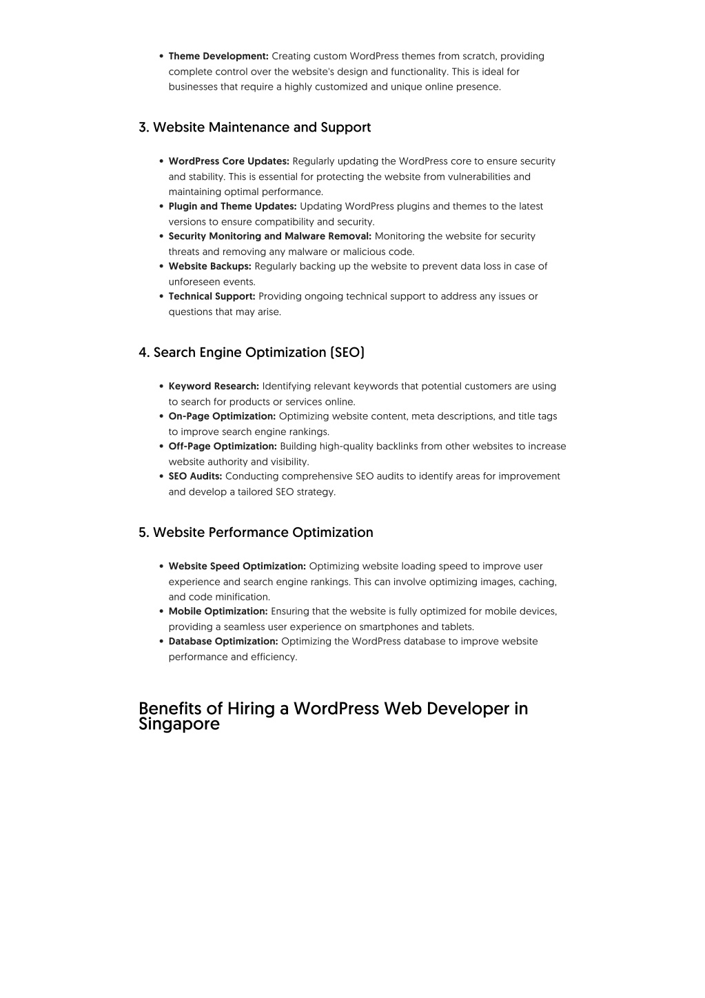 • Theme Development: Creating custom WordPress themes from scratch, providing complete control over the website's design and functionality. This is ideal for businesses that require a highly customized and unique online presence. 3. Website Maintenance and Support • WordPress Core Updates: Regularly updating the WordPress core to ensure security and stability. This is essential for protecting the website from vulnerabilities and maintaining optimal performance. • Plugin and Theme Updates: Updating WordPress plugins and themes to the latest versions to ensure compatibility and security. • Security Monitoring and Malware Removal: Monitoring the website for security threats and removing any malware or malicious code. • Website Backups: Regularly backing up the website to prevent data loss in case of unforeseen events. • Technical Support: Providing ongoing technical support to address any issues or questions that may arise. 4. Search Engine Optimization (SEO) • Keyword Research: Identifying relevant keywords that potential customers are using to search for products or services online. • On-Page Optimization: Optimizing website content, meta descriptions, and title tags to improve search engine rankings. • Off-Page Optimization: Building high-quality backlinks from other websites to increase website authority and visibility. • SEO Audits: Conducting comprehensive SEO audits to identify areas for improvement and develop a tailored SEO strategy. 5. Website Performance Optimization • Website Speed Optimization: Optimizing website loading speed to improve user experience and search engine rankings. This can involve optimizing images, caching, and code minification. • Mobile Optimization: Ensuring that the website is fully optimized for mobile devices, providing a seamless user experience on smartphones and tablets. • Database Optimization: Optimizing the WordPress database to improve website performance and efficiency. Benefits of Hiring a WordPress Web Developer in Singapore