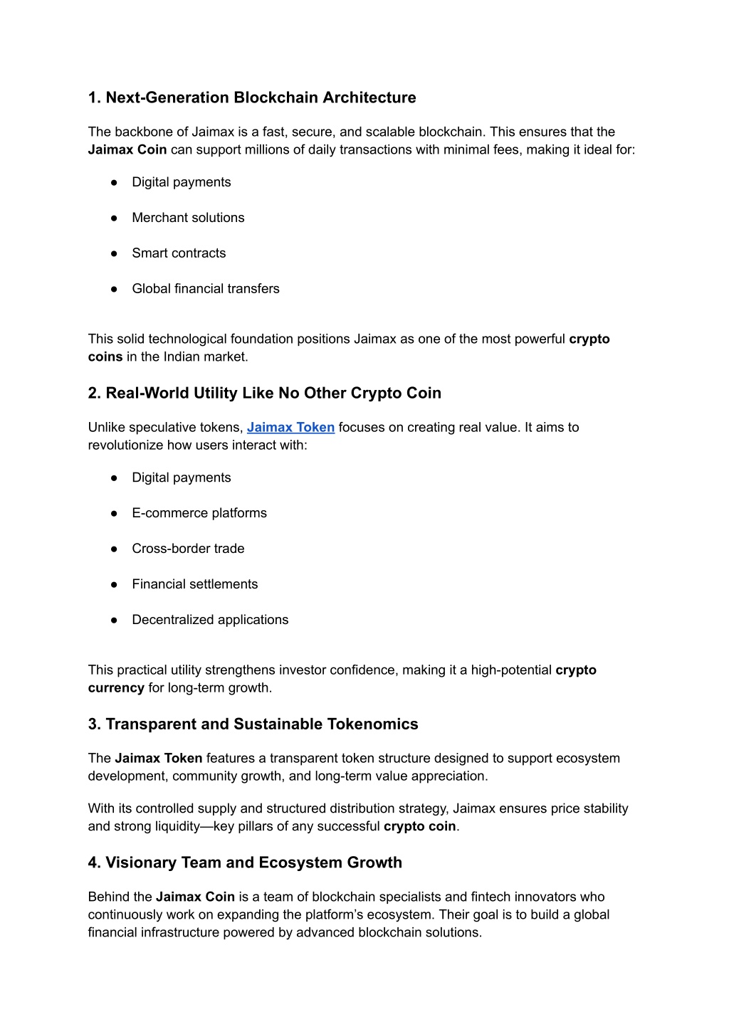 2. 1. Next-Generation Blockchain Architecture The backbone of Jaimax is a fast, secure, and scalable blockchain. This ensures that the Jaimax Coin can support millions of daily transactions with minimal fees, making it ideal for: ● Digital payments ● Merchant solutions ● Smart contracts ● Global financial transfers This solid technological foundation positions Jaimax as one of the most powerful crypto coins in the Indian market. 2. Real-World Utility Like No Other Crypto Coin Unlike speculative tokens, Jaimax Token focuses on creating real value. It aims to revolutionize how users interact with: ● Digital payments ● E-commerce platforms ● Cross-border trade ● Financial settlements ● Decentralized applications This practical utility strengthens investor confidence, making it a high-potential crypto currency for long-term growth. 3. Transparent and Sustainable Tokenomics The Jaimax Token features a transparent token structure designed to support ecosystem development, community growth, and long-term value appreciation. With its controlled supply and structured distribution strategy, Jaimax ensures price stability and strong liquidity—key pillars of any successful crypto coin. 4. Visionary Team and Ecosystem Growth Behind the Jaimax Coin is a team of blockchain specialists and fintech innovators who continuously work on expanding the platform’s ecosystem. Their goal is to build a global financial infrastructure powered by advanced blockchain solutions.