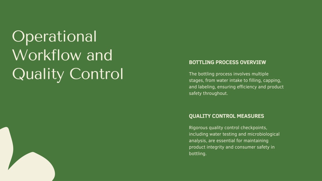BOTTLING PROCESS OVERVIEW • The bottling process involves multiple stages, from water intake to filling, capping, and labeling, ensuring efficiency and product safety throughout. • Operational Workflow and Quality Control • QUALITY CONTROL MEASURES • Rigorous quality control checkpoints, including water testing and microbiological analysis, are essential for maintaining product integrity and consumer safety in bottling.