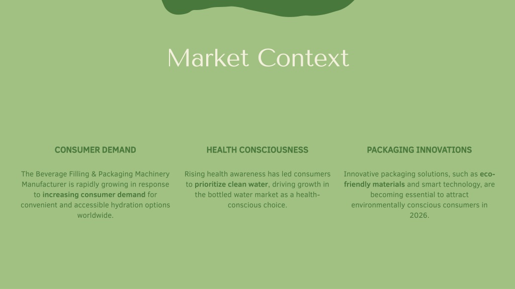 CONSUMER DEMAND • HEALTH CONSCIOUSNESS • PACKAGING INNOVATIONS • The Beverage Filling & Packaging Machinery Manufacturer is rapidly growing in response to increasing consumer demand for convenient and accessible hydration options worldwide. • Rising health awareness has led consumers to prioritize clean water, driving growth in the bottled water market as a health-conscious choice. • Innovative packaging solutions, such as eco-friendly materials and smart technology, are becoming essential to attract environmentally conscious consumers in 2026. • Market Context