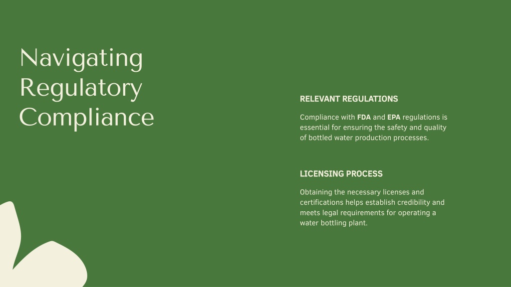 RELEVANT REGULATIONS • Compliance with FDA and EPA regulations is essential for ensuring the safety and quality of bottled water production processes. • Navigating Regulatory Compliance • LICENSING PROCESS • Obtaining the necessary licenses and certifications helps establish credibility and meets legal requirements for operating a water bottling plant.