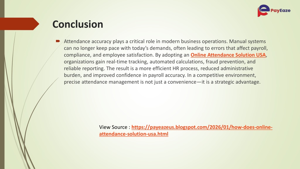 7. Conclusion • Attendance accuracy plays a critical role in modern business operations. Manual systems can no longer keep pace with today’s demands, often leading to errors that affect payroll, compliance, and employee satisfaction. By adopting an Online Attendance Solution USA, organizations gain real-time tracking, automated calculations, fraud prevention, and reliable reporting. The result is a more efficient HR process, reduced administrative burden, and improved confidence in payroll accuracy. In a competitive environment, precise attendance management is not just a convenience—it is a strategic advantage. View Source : https://payeazeus.blogspot.com/2026/01/how-does-online-attendance-solution-usa.html