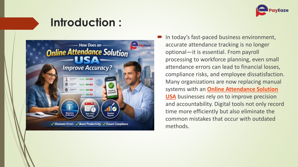 2. Introduction : • In today’s fast-paced business environment, accurate attendance tracking is no longer optional—it is essential. From payroll processing to workforce planning, even small attendance errors can lead to financial losses, compliance risks, and employee dissatisfaction. Many organizations are now replacing manual systems with an Online Attendance Solution USA businesses rely on to improve precision and accountability. Digital tools not only record time more efficiently but also eliminate the common mistakes that occur with outdated methods.