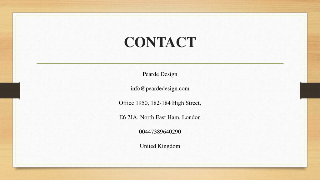 CONTACT Pearde Design info@peardedesign.com Office 1950, 182-184 High Street, E6 2JA, North East Ham, London 00447389640290 United Kingdom