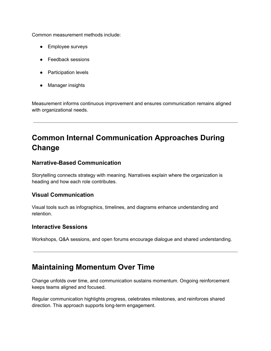Common measurement methods include: ● Employee surveys ● Feedback sessions ● Participation levels ● Manager insights Measurement informs continuous improvement and ensures communication remains aligned with organizational needs. Common Internal Communication Approaches During Change Narrative-Based Communication Storytelling connects strategy with meaning. Narratives explain where the organization is heading and how each role contributes. Visual Communication Visual tools such as infographics, timelines, and diagrams enhance understanding and retention. Interactive Sessions Workshops, Q&A sessions, and open forums encourage dialogue and shared understanding. Maintaining Momentum Over Time Change unfolds over time, and communication sustains momentum. Ongoing reinforcement keeps teams aligned and focused. Regular communication highlights progress, celebrates milestones, and reinforces shared direction. This approach supports long-term engagement.