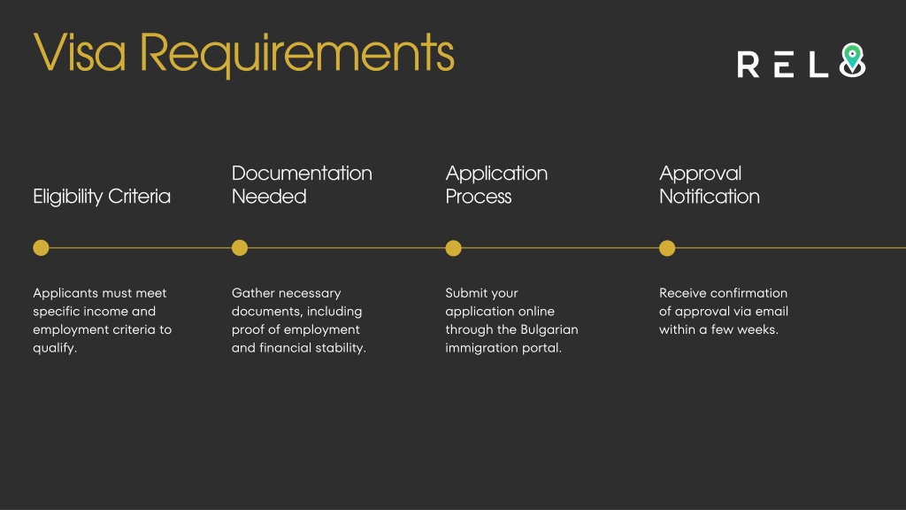 Visa Requirements • Documentation Needed • Application Process • Approval Notification • Eligibility Criteria • Applicants must meet specific income and employment criteria to qualify. • Gather necessary documents, including proof of employment and financial stability. • Submit your application online through the Bulgarian immigration portal. • Receive confirmation of approval via email within a few weeks.
